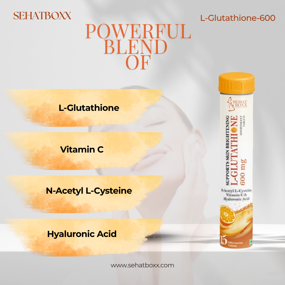 SehatBoxx L-Glutathione Effervescent Tablets are scientifically formulated to support skin brightening, antioxidant protection, and internal detoxification. Each tablet delivers 600 mg of L-Glutathione, combined with N-Acetyl L-Cysteine (NAC), Vitamin C, and Hyaluronic Acid, ensuring enhanced absorption and clinical efficacy.